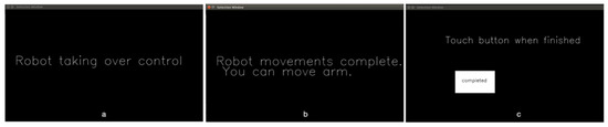 Figure 4. Messages displayed on GUI. (a) is the message displayed on the touchscreen during the Autonomy state. (b) is displayed once autonomous control has finished and transitions to the user controlled Teleop Free state. (c) is the message displayed during Teleop in Task where the system waits until the user is done with a temporal operation (i.e., filling the cup with water, or drinking from the cup) before transitioning back to Autonomy.