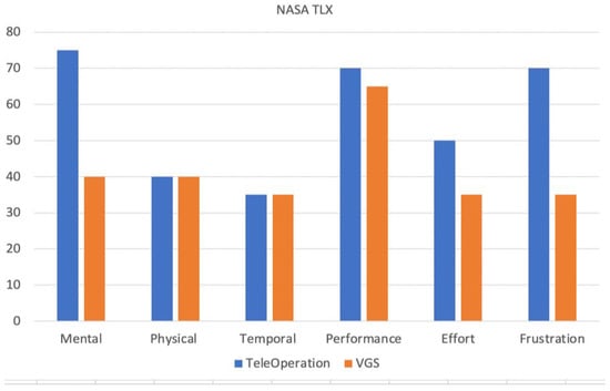 The case participant was a 36-year-old male with C-6 incomplete spinal cord injury. He chose to use a 2-DoF joystick with two external switch buttons placed on the armrest of his power wheelchair. His performance with teleoperation and VGS is shown in Table 7 and Table 8. In addition, his ratings on the six dimensions of the NASA-TLX for both control methods are shown in Figure 6. He rated the usability of teleoperation with a SUS of 70 and the usability of VGS with a SUS of 72.5.