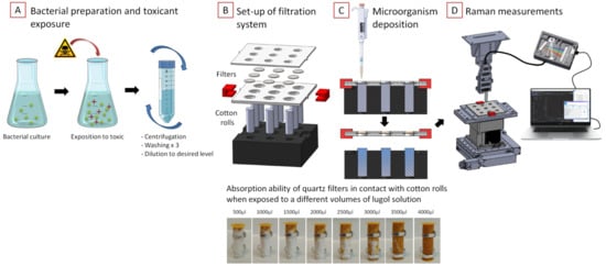 Schema of the toxicity test procedure with the automated spectroscopic system: (A) Bacterial preparation and toxicant exposure followed by washing steps to prepare sample for filtration. (B) Set-up of multi-well support system for filtration with absorbing cotton rolls and quartz fiber filters. (C) Principle of microorganism suspension filtration and liquid absorption by cotton rolls with a function for disconnecting the filters from the wet cotton and fixing them on the motorized 3-axis platform. Demonstration of the ability of quartz fiber filter (diameter 16 mm) to absorb different volumes of Lugol’s solution when in contact with cotton rolls (diameter 12 mm, height 32 mm). (D) Automatic spectroscopic measurements with fixed Raman fiber-optic probe head connected to a spectrometer and motorized 3-axis programmed platform simultaneously controlled from a connected computer using a specifically designed API.