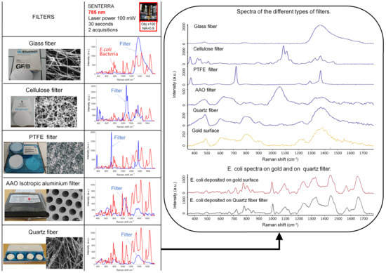 Filter selection based on spectra: (Left) Table: Raman signatures of the five tested filters compared with that of E. coli MG1655. Blue spectra: filter signatures; red spectra: E. coli bacterial signature on a gold surface. All spectra presented were measured at a 785 nm laser excitation wavelength and the same acquisition parameters, using the microscope objective ×100 NA = 0.8. (Right) Spectral comparison of the five filters, a clean gold surface and E. coli bacteria on a gold surface and on a quartz fiber filter.