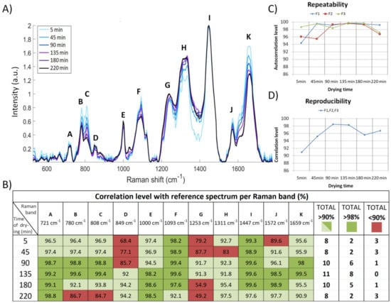 The correlations of the 11 Raman bands with the reference spectrum were calculated to determine at what moment the spectra from filtrated bacteria could be qualified for toxicity evaluation. The reference spectrum is the Raman signal issued from E. coli deposited on a gold surface. The average correlation values of each Raman band per drying time with the corresponding Raman band of the reference spectrum are presented in the table of Figure 3B.