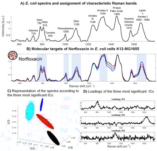 Effects of norfloxacin on the Raman spectra of E. coli MG1655: (A) Assignment of some characteristic bands in the bacterial spectrum. (B) Averages of seven Raman spectra obtained following exposure of the bacteria to different concentrations of norfloxacin. The highlighted bands are those that allow the spectra to be classified according to the different concentrations of toxicant. (C) Three-dimensional (3D) representation of the spectral distribution according to the three most significant components from the ICA. (D) Loadings of the most significant ICs from the analysis of Raman spectra of E. coli MG1655 exposed to norfloxacin. The spectra were decomposed by ICA, and the most significant ICs were then selected. (E) ANOVA analysis of the distribution of the spectra according to the most significant component (p-value < 0.05). (F) Classification results of the sFDA performed after the pre-processing steps of spectrum selection (size of sample: 24 spectra).