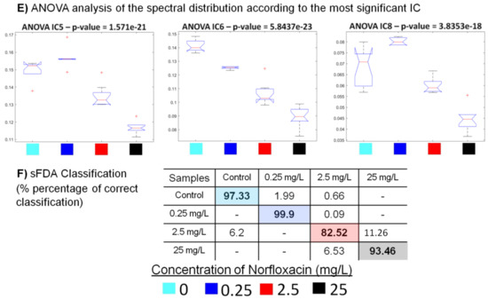 Stepwise factorial discriminant analysis (sFDA) was performed on the scores of independent components from the ICA procedure to assess the level of correct prediction in assigning spectra to a particular group (Figure 4F). Correct classification percentages for the control and the different norfloxacin concentrations (0.25, 2.5 and 25 mg.L) were 97, 99, 82 and 93%, respectively. These results, obtained by a portable fiber-optic spectrometer, are comparable to those from a previous study obtained with a benchtop confocal Raman spectrometer [28].