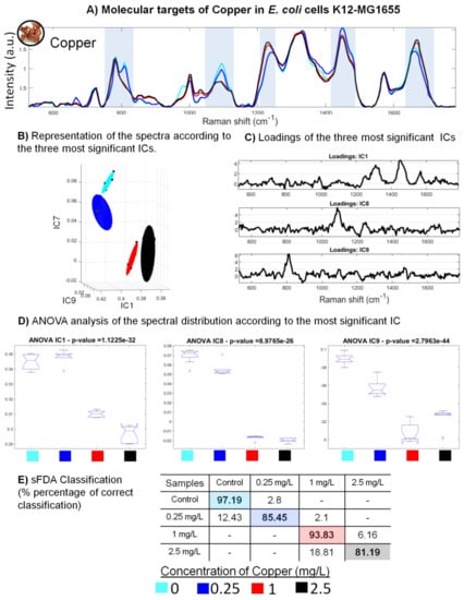 Effects of copper on the Raman spectra of E. coli MG1655: (A) Averages of seven Raman spectra obtained following exposure of the bacteria to different concentrations of copper. The highlighted bands are those that allow the spectra to be classified according to the different concentrations of toxicant. (B) Three-dimensional (3D) representation of the spectral distribution according to the three most significant components from the ICA. (C) Loadings of the most significant ICs from the analysis of Raman spectra of E. coli MG1655 exposed to copper. The spectra were decomposed by ICA, and the most significant ICs were then selected. (D) ANOVA analysis of the distribution of the spectra according to the most significant component (p-value < 0.05). (E) Classification results of the sFDA performed after the pre-processing steps of spectrum selection (size of sample: 24 spectra).
