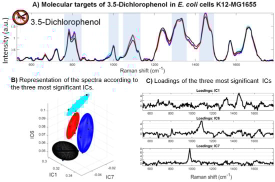 The analysis of the spectral signature of E. coli cells exposed to different concentrations of 3,5-dichlorophenol shows Raman bands impacted by this toxicant (Figure 6). The toxicity signature of this pollutant specifically concerns the bands associated with phenylalanine (1000 cm) and the DNA phosphate groups (1100 cm). The intensity of these bands diminishes with increasing concentrations of the toxicant (Figure 6B). A band associated with amides II (1330 cm) is slightly higher for the highest concentration of toxicant, although it can be noted that in general, the intensity of this band does not change very much. Highlighted by the most discriminating component of the ICA results, these bands are the most significant for characterizing the effects of 3,5-dichlorophenol on E. coli MG1655 (Figure 6C,D). These three IC loadings can be seen to vary, and ANOVA reveals a significant difference between the control and 3,5-dichlorophenol-treated bacteria (p-value < 0.05) (Figure 6E).