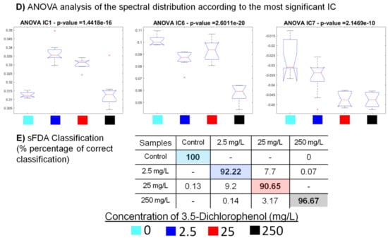 Stepwise factorial discriminant analysis (sFDA) demonstrates good classification scores for the control and different 3,5-dichlorophenol concentrations (2.5, 25, and 250 mg.L) correct at 100, 92, 90, and 96%, respectively (Figure 6E).