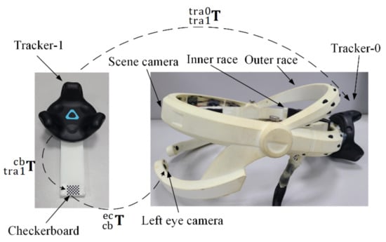As shown in Figure 2, cameras and Tracker-0 are fixed with the outer race, the inner race is fixed with the user’s head when the system is working, and the outer race can rotate relative to the inner race for suitable wearing. Therefore, the transformation between the cameras and Tracker-0 is constant, and the estimation for is needed only once.