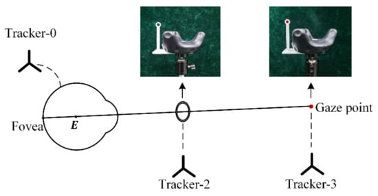 Estimation of the eyeball center with developed calibration tools. The transformation between Tracker-2 and the small hole is predefined, and the coordinate of gaze point in Tracker-3 coordinate system is predefined.