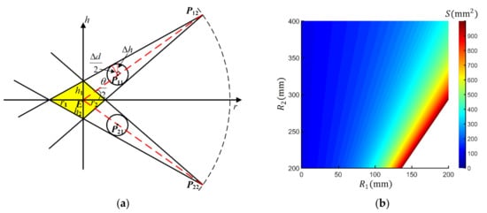 The error analysis of eyeball center calibration is shown in Figure 4a. There are two different visual axes collected in the Tracker-0 coordinate system. The maximum error between the collected line and the visual axis is determined by the diameter of the hole. The two error cones formed by and intersect to form a yellow diamond-like error region on the plane. Assuming that represents the distance between the eyeball center and the center of the small hole, represents the distance between the eyeball center and the gaze point. Based on triangular similarity, the region width satisfies,
