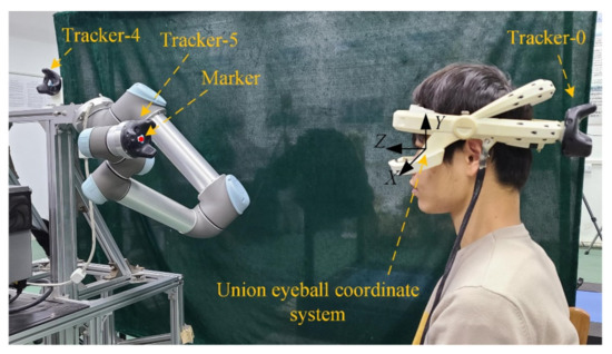 The average quaternion is the eigenvector of corresponding to the maximum eigenvalue. Then, can be calculated by combining and . Similarly, the transformation matrix between the scene camera and Tracker-0 can be calculated. Then, the transformation matrix between the scene camera and eye camera can be calculated by