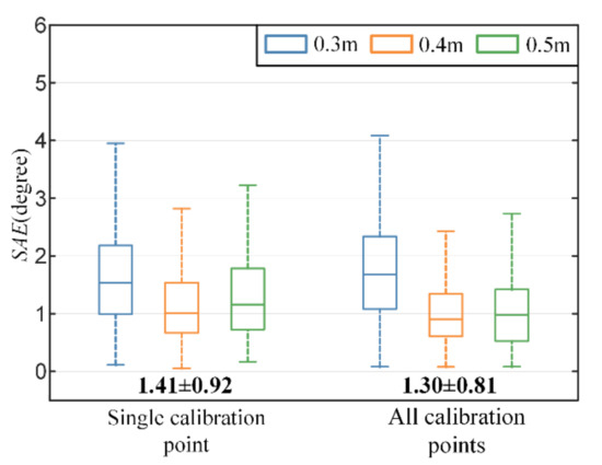 The proposed recalibration method re-estimates the transformation matrix between the eyeball and scene camera coordinate system with the proposed geometry-based method and utilizes calibration points to rectify the parameters of the gaze estimation model. To reveal the influence of the number of calibration points on gaze estimation performance in recalibration, two strategies are implemented and compared. One uses a single calibration point, and the other uses all calibration points at depth of 0.5 m. As mentioned in Section 2.5, the positions of calibration points on calibration plane are determined by eyeball horizontal rotation angle , and vertical rotation angle . Without loss of generality, the calibration point whose polar coordinate is closest to (0,0) is selected to verify the single-point strategy. As shown in Figure 8, the mean and standard deviation of error in situation 1 (single calibration point) are slightly higher than the other two situations. The overall gaze accuracy performance of them is comparable (the paired-t test: ).