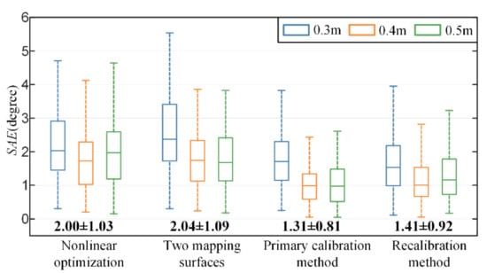 In comparison, our proposed primary recalibration method and recalibration method use the training set at a depth of 0.5 m. As shown in Figure 9, the proposed primary calibration method achieves the lowest mean error, followed by the proposed recalibration method. There is no significant difference between their overall gaze estimation performance (the paired-t test: ). In addition, the mean error of the method with nonlinear optimization is slightly lower than the error of the method with two mapping surfaces. Compared to the method with nonlinear optimization, the proposed primary calibration and recalibration method improve accuracy by 35 percent (from a mean error of 2.00 degrees to 1.31 degrees) and 30 percent (from a mean error of 2.00 degrees to 1.41 degrees).