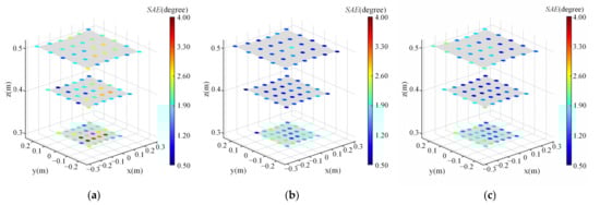 The scene angular error at each of the 90 test points for different methods. Noted that the error of each test point is calculated by averaging the error of the same test point for all subjects. The coordinates of these test points are represented in union eyeball coordinate system. (a) Nonlinear optimization. (b) Primary calibration method. (c) Recalibration method.