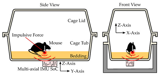 In this work, activity of the mouse is estimated by measuring the structural vibrations of the cage with a 9-axis IMU SOC as shown in Figure 1 and Figure 2. The proposed sensor integrates nine sensors in a single SOC and measures acceleration, angular rate and magnetic fields in the three spatial directions X, Y and Z. In this application, data of the magnetometer is omitted. The individual sensors are layered on top of each other in an integrated SOC using MEMS manufacturing technics. The complete package has a size of 3 × 3 × 1 . Although IMUs are better described as sensor modules, in this work IMUs will be referred to as a sensor. When mounted to the cage floor, the IMU measures the vibrations of the cage at the mounting point as acceleration and angular rate in the three axis X, Y and Z. An advantage of the small dimensions of the IMU is the minimal influence on the natural frequencies of the cage. The acceleration measurements depict linear deflection and motion while the angular rate measurements depict twisting and rotational oscillations. The structural vibrations measured by the IMU are expected to exhibit different properties in the three spatial directions due to the geometry of the cage. In Z-axis a membrane-like vibration of the cage floor is expected. In X- and Y-axis vibration is expected to originate from oscillation of the whole cage, because these axes are aligned parallel to the plane of the cage floor. For concise monitoring and depiction of activity, metrics and classes have to be defined to describe different activity patterns of the inhabitant. This is described in Section 3.1.