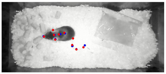 This figures shows a video frame of the camera reference system. The red dots illustrate manually set pose labels. The blue dots are estimates of a retrained deeplabcut network.