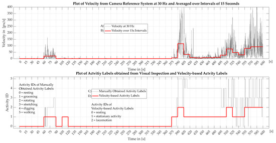 The Figure 4 shows two graphs with four plots containing activity and velocity data of one of the aforementioned seven clips which were manually annotated with activity labels. These plots show ten minutes of mouse activity with (A) the raw velocity values as explained in Section 2.3 (B) the raw velocity values averaged over an interval of 15 s (C) the activity labels by visual inspection and (D) the velocity-based activity labels.