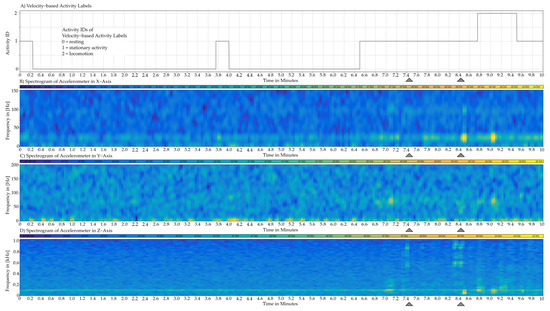 This figure shows four synchronized plots over a length of ten minutes which contain ground truth activity labels and the spectrogram of all accelerometer axis. The gray triangles mark two special case activities, that were observed by manually viewing the video recordings.