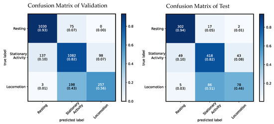 When comparing the results of the validation during training and the results achieved on unseen test data, the total accuracy differs by 2.5%. In the classes resting and stationary activity the TPR between validation and testing differs by less than a percent. In the class locomotion a difference of about 10% is observed.