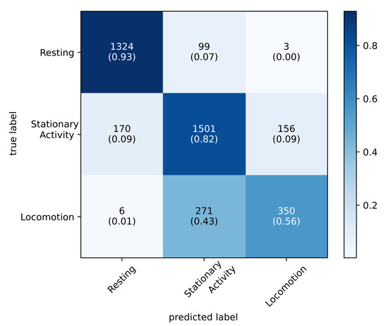 The optimizable ensemble classification model achieves a validation accuracy of 82.3% and a test accuracy of 79.8% when all features are used. The confusion matrix is presented in Figure 6. In testing, the class resting has the highest true positive rate (TPR) of 94.1% with a PPV of 84.8%. The class stationary activity ranks second and achieves a TPR of 82% with a positive predictive value (PPV) of 80.2%. The class locomotion achieves a TPR of 46.2% with a PPV of 63.4%.