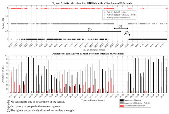 Using the method described in Section 4.1, continuous activity monitoring is demonstrated on the measurements obtained at the VTK. The final classification model, which is trained using 16.17 h of data, is used to analyze the 27.67 h of data collected during the measurements at the VTK. The 16.17 h of data used for training are contained in the 27.67 h of data. For continuous activity monitoring, the data are divided into sections with a timeframe of 15 s length. Each timeframe is classified individually. The output of this operation is an array with 6640 elements. Each element contains the point of time and the activity label. The output array is plotted in Figure 8.