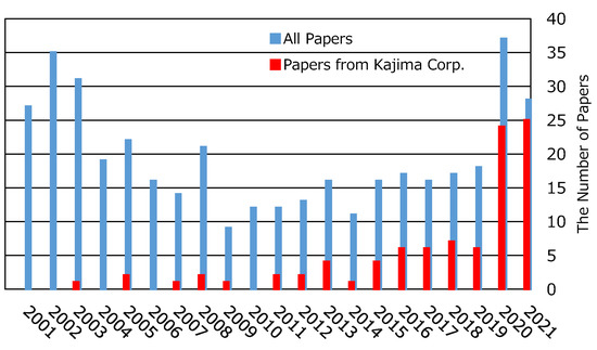The growing interest in using DFOS is also exhibited in the number of papers related to DFOS in the Japanese Civil Engineering Association. It has rapidly increased in the last 3 years, as shown in Figure 2, where red bars denote the publications from Kajima Co. (Tokyo, Japan). There is already a number of major projects, in which DFOS technology will be deployed to monitor critical parameters during their engineering phase. The total estimated budget for these projects is USD 2000 MM or more over the next 3 to 10 years.