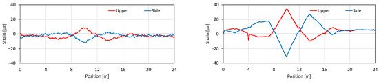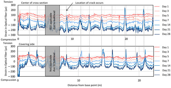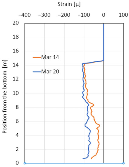 With the installed optical fiber, it is possible to pinpoint the location of abnormal strains. An example of such measurements is presented in Figure 12.