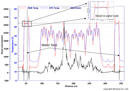 The accuracy of such an approach is clearly demonstrated when compared with traditional DTS measurements. As an example, we present the temperature obtained after 7 years of continuous monitoring of permanently embedded fibers. In this application, there are multi-mode (MM) and single-mode (SM) fibers in the same sensing cable, and additionally, there are water tanks on both sides of the fiber loop for DTS calibration. The Brillouin IU used is PPP-BOTDA [15,16]. The drift of center frequency along the distance does not pose a problem here, as the distance is short.