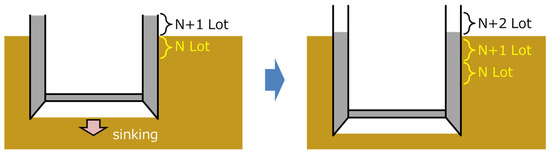 A caisson is a box- or cylindrical- shaped, watertight structure, usually made of reinforced concrete and built first on the ground and then installed by sinking it into the ground while excavating the lower part. An example of such construction is shown in Figure 10. Figure 11 schematically presents the sequential and repeatable process always involved in the construction. For each lot, reinforcing steel and formwork are assembled, and concrete is poured, cured, de-framed, and sunk. This process is repeated for each lot.
