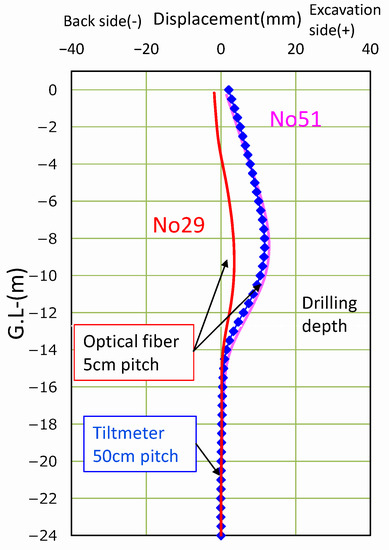 The results are shown in Figure 15. The vertical axis indicates the position in the depth direction, and the horizontal axis obtained displacement. The red line is the result of No. 29 and the pink line is the result of No. 51 optical fibers. The excavation causes a slight deformation towards the excavation side, centering between 8 and 10 m. The blue line is the displacement obtained by the inclinometer.