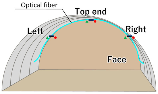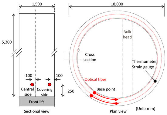 The application of the DFOS for monitoring tunnel excavation is one typical example of technology deployment. This time measurements were obtained in real-time and used during construction to ensure its safety. The fiber layout and location of strain gauges, used for validation purposes, are presented in Figure 16.
