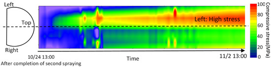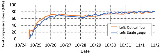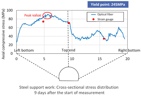 Finally, Figure 19 shows the cross-sectional stress distribution 9 days after the start of measurement. Blue is the optical fiber data and red dots are the values from strain gauges.