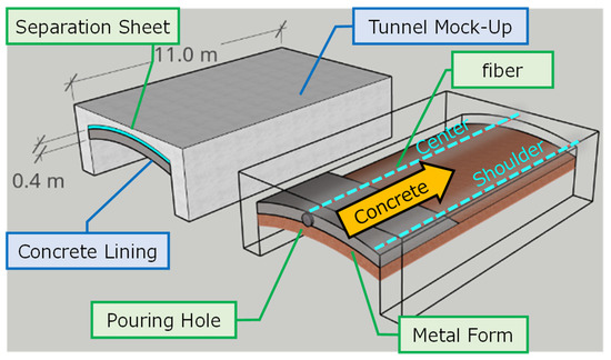 We proposed to use DFOS and strain change measurements to detect, in real-time, the location of the voids. Kajima Co. decided to test this procedure not only in the lab, but in large-scale, controlled experiments. For this purpose, the 11 m long tunnel mockup was constructed, with 40 cm concrete lining. Two sensing fibers were installed in the center and shoulder of the frame. The mockup dimensions and locations of the fibers are presented in Figure 24.
