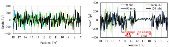 During the entire period of concrete injection Rayleigh-based, strain change measurements were performed and the values were monitored in real-time. Figure 26 presents selected traces after 0, 60, 90, and 120 min for center (left) and shoulder (right) fibers.