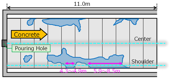 The front of the moving concrete was clearly detected on both fibers, so the progress of filling was observed. While the concrete completely filled the center part of the frame, there were two locations on the shoulder fiber with no response (strain change), indicating the location of voids. Those regions, from 4.3 to 4.9 m and from 5.8 to 8.5 m, are indicated in Figure 26 (right). Those locations were later confirmed by visual inspection and measurements as voids. The locations of all the voids and regions indicated by DFOS measurements are presented in Figure 27.