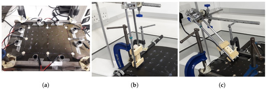Experimental set-up of the apparatus for data collection showing (a): the flat composite plate, with the attached sensors, (b): rail guided impactor at , and (c): rail guided impactor at . The figure is a modified version of Figure 1 in [11].