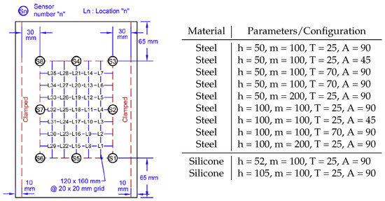 Layout of the plate tests with the sensor and impact locations. The figure is a modified version of Figure 2 in [11]. The table gives information about the configurations for the performed tests.
