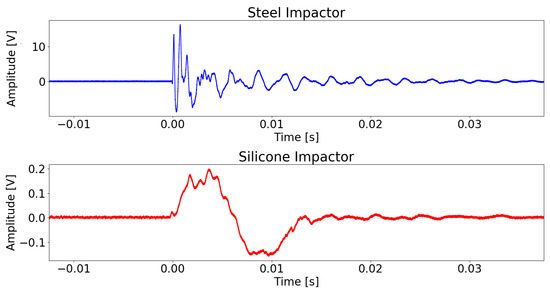 Sensor signal recording for a steel and silicone impactor. All parameters between the two impacts are kept the same, only the impactor material was changed.