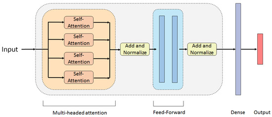- Multi-Headed Attention: Passing the data through one Self-Attention sub-layer will extract some data dependencies. In order to boost performance and capture a larger number of relations from a sequence, N number of Self-Attention sub-layers (heads) can be stacked in parallel to create a Multi-Headed Attention sub-layer. Q, K and V matrices are created for each head independently, using learned linear projection weight matrices. The column dimensions of the query, key, and value for each head are taken to be the same, equal to . This creates different subspace representations of the query, key, and value for each Attention head, which then are fed into the scaled dot-product attention:where i denotes the head number, are the projection weight matrices for the i-th head, and is the attention matrix of the i-th head [36]. The separate query, key and value representations allow each head to derive different information from the same input data. At the output of all the parallel heads, the calculated attention matrices are concatenated, to form a matrix with the dimensions of the input matrix, . This new matrix is multiplied by a matrix of weights . This extracts global relations from the sequence data. It also gives one more weight matrix for the network to optimize and improve performance. Deeper analysis into Self and Multi-Headed Attention can be found in [37,38].