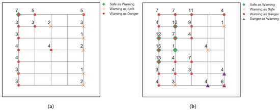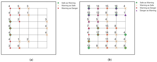 Locations of the misclassified impacts from the testing data for (a): 20% training data model, with 66/1008 misclassifications, and (b): 10% training data model, with 286/1134 misclassifications. The legends give information of the markers used, and the numbers next to the markers indicate the number of misclassifications on that location.