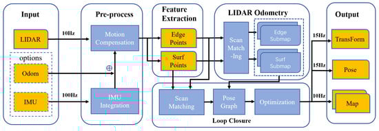 A system overview of the proposed SLAM framework. The main part of this method consists of feature extraction, local lidar odometry and loop closure. Without considering the limitation that the maximum frequency of the input point cloud is 10 Hz, we can achieve a 15 Hz pose estimation and 10 Hz mapping output.