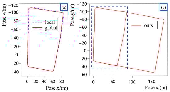 Trajectory results on our dataset. Trajectory (a) shows the comparison of the trajectory with loop closure constraint and the trajectory without loop closure constraint of the road segment designed with loop closure. Trajectory (b) shows the complete trajectory.