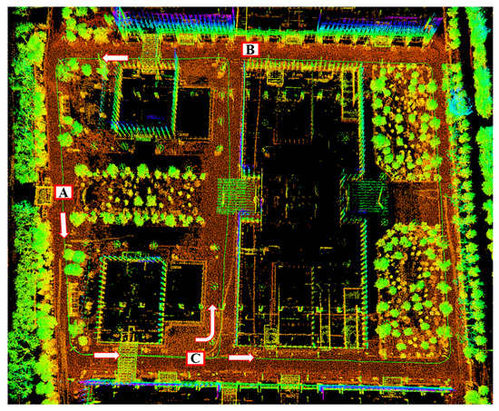 The trajectory obtained using our approach and the final map conducted using our approach are shown in Figure 5 and Figure 6. In Figure 6, we show the motion path for collecting the data and mark the direction of movement of our vehicle, starting from A and ending at B. We also design the road segments A–C with loop closures so that the vehicle passes by A–C twice. Combined with the trajectory and map conducted using our approach, we achieve global consistency and a good mapping result. However, due to the poor reliability of RTK in the environment of high buildings, we did not conduct an error evaluation on the trajectory for the time being.