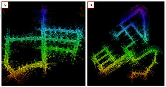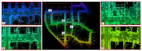 As shown in Figure 10, we ensured the global consistency of each loop closure node through pose graph optimization. For example, we focused on the analysis of the road section ABCD, where the vehicle passes twice when collecting data. Intuitively, the point clouds collected by the vehicle passing the same road section twice had no distinct inconsistency on the map. This was precise because of the addition of loop-closure detection, which is running in the background, and thus we realize the consistency of global trajectory, which is also shown in Figure 8a.