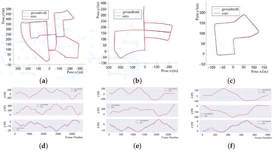 The experimental results on KITTI. The trajectory output of our proposed approach is plotted as a red solid line, while the ground truth is plotted as a blue dashed line. (a) KITTI00 trajectory; (b) KITTI05 trajectory; (c) KITTI07 trajectory; (d) KITTI00 error distribution; (e) KITTI05 error distribution; and (f) KITTI07 error distribution.