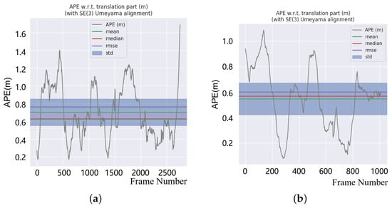 Then, we conducted a further error analysis and calculated the Absolute Pose Error, defined as APE by Evo Python evaluating package, to evaluate the overall consistency of the out trajectory and ground truth. The absolute pose errors on KITTI sequence 05 and sequence 07 are shown in Figure 9. Figure 9 shows that we achieved global localization with a pose estimation error of not more than 1.69 m and 0.702 m average error, indicating that a low-drift global localization was obtained.