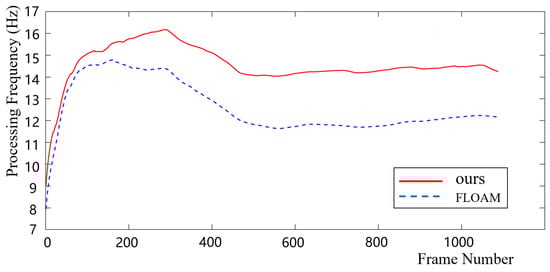 Moreover, in order to verify the real-time performance of our algorithm, we conducted a comparative experiment with our algorithm and FLOAM [13] on the same KITTI dataset, respectively, using a computing platform with not very high computing power, i7-6700HQ mentioned above. Figure 11 shows that the two algorithms can realize real-time pose estimation even using the computing platform with limited resources. On this same platform, we processed faster than FLOAM, which is known for its real-time pose estimation performance. We can conclude that our odometry updates at nearly 15 Hz, faster than the lidar’s 10 Hz. This means that we take full advantage of the lidar data we have collected.