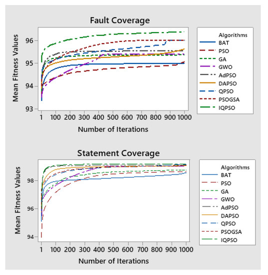 Table 4 shows the mean fitness and variance of performance metrics as well as their corresponding Tukey group ranks for all of the programs. The observations state that IQPSO is statistically different from all other nature-inspired algorithms, with a p-value of less than 0.05, for both statement and fault criteria except PSOGSA. Moreover, it suggests that there is no significant difference between the means of (1) PSOGSA and QPSO, (2) AdPSO and DAPSO, (3) AdPSO and GWO and (4) GA and PSO for both criteria. The convergence curves for one of the versions of the subject programs are illustrated in Figure 1. It shows that the proposed IQPSO Algorithm possesses high-quality solutions for both criteria.