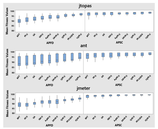 It was also observed that most of the algorithms had equivalent variance in the case of statement coverage. The boxplots in Figure 2 also depict variation in algorithmic performance for fault coverage that is higher for statement coverage. This is because faults are dispersed across the entire software. In other words, most test cases cover almost the same statements. Therefore, the statement coverage boxplots are more compressed than the fault coverage boxplots. Overall, the proposed IQPSO is superior to all other algorithms in terms of variance.