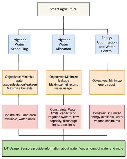 Smart Agriculture involves the use of digital technologies such as sensors and intelligent systems to improve agricultural productivity. The sustenance of agriculture depends on water, and it is central to the agricultural production of food items around the world. However, water is becoming an ever-scarce resource due to the increasing demand caused by human population growth, increased economic activity by industries and also due to climate change. It therefore is necessary to utilize this precious resource wisely so as make use of it in the best manner possible. One approach towards ensuring that water and land is used appropriately is by introducing irrigation management schemes such as irrigation scheduling and water allocation in the farming process. A summary of the optimization problems, objectives, constraints in smart agriculture and the use of IoT is illustrated in Figure 1.