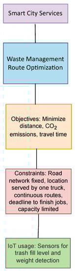 According to the world bank, the amount of annual solid waste generated is set to be 3.40 billion tons [26] in 2050. Managing this waste and its collection in an efficient manner is imperative for health and climate reaons. The most common application towards smart city services optimization is waste management as illustrated in Figure 2 which summarizes the objectives, constraints and the use of IoT.